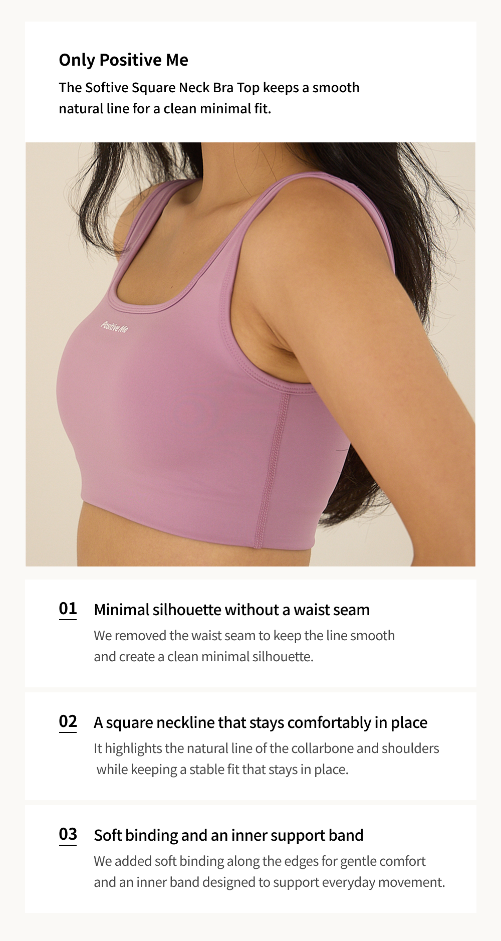 The square neckline frames the collarbone and upper body while fitting comfortably against the skin so it stays secure during movement. An inner support band stabilizes the chest, and soft binding along the edges helps reduce friction for all-day comfort.