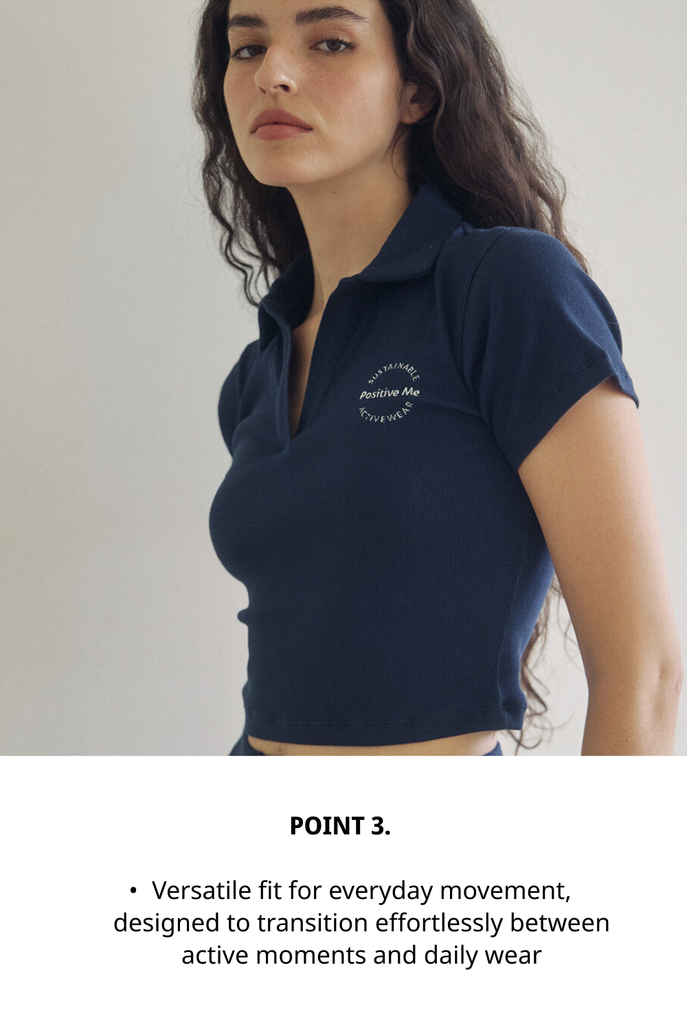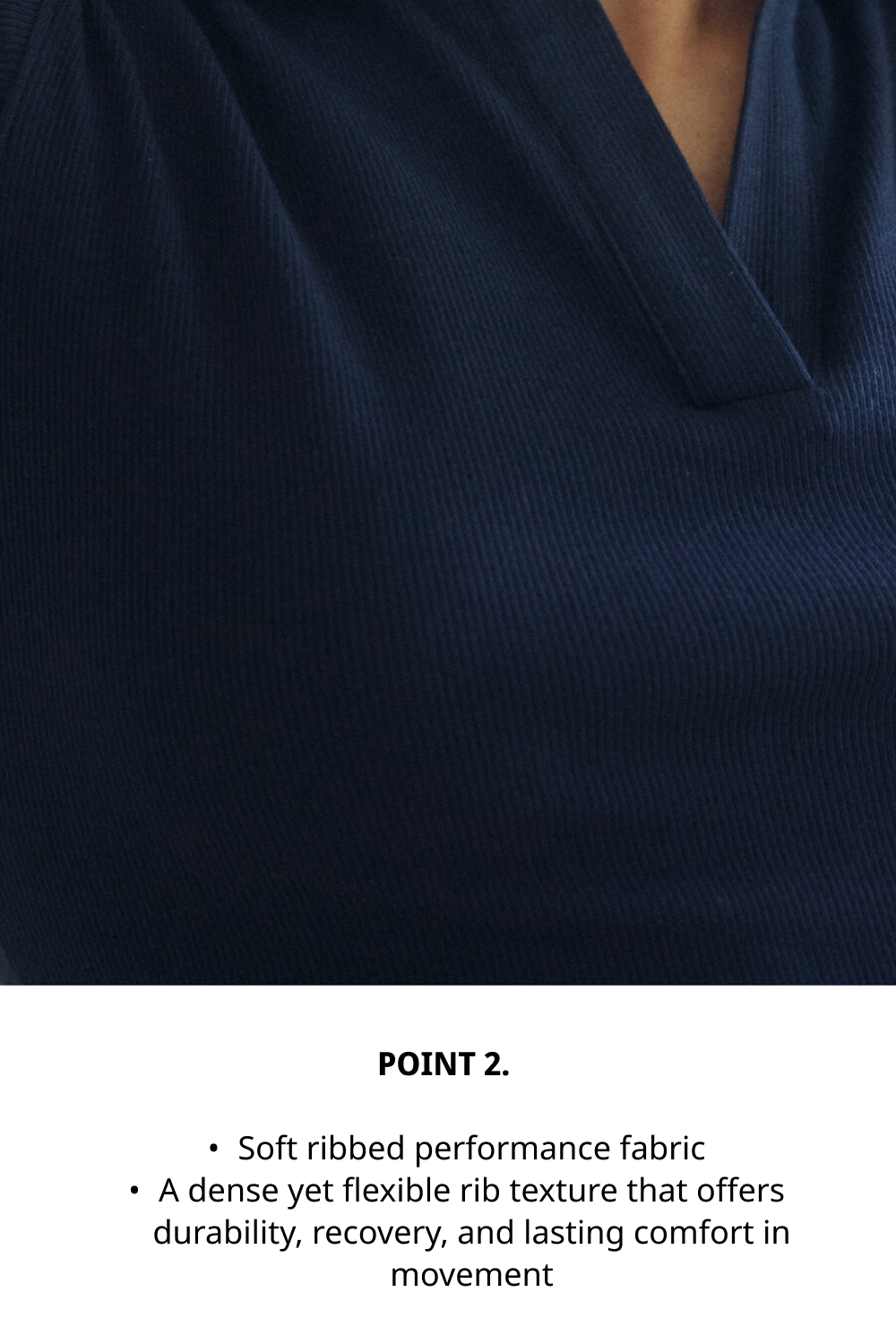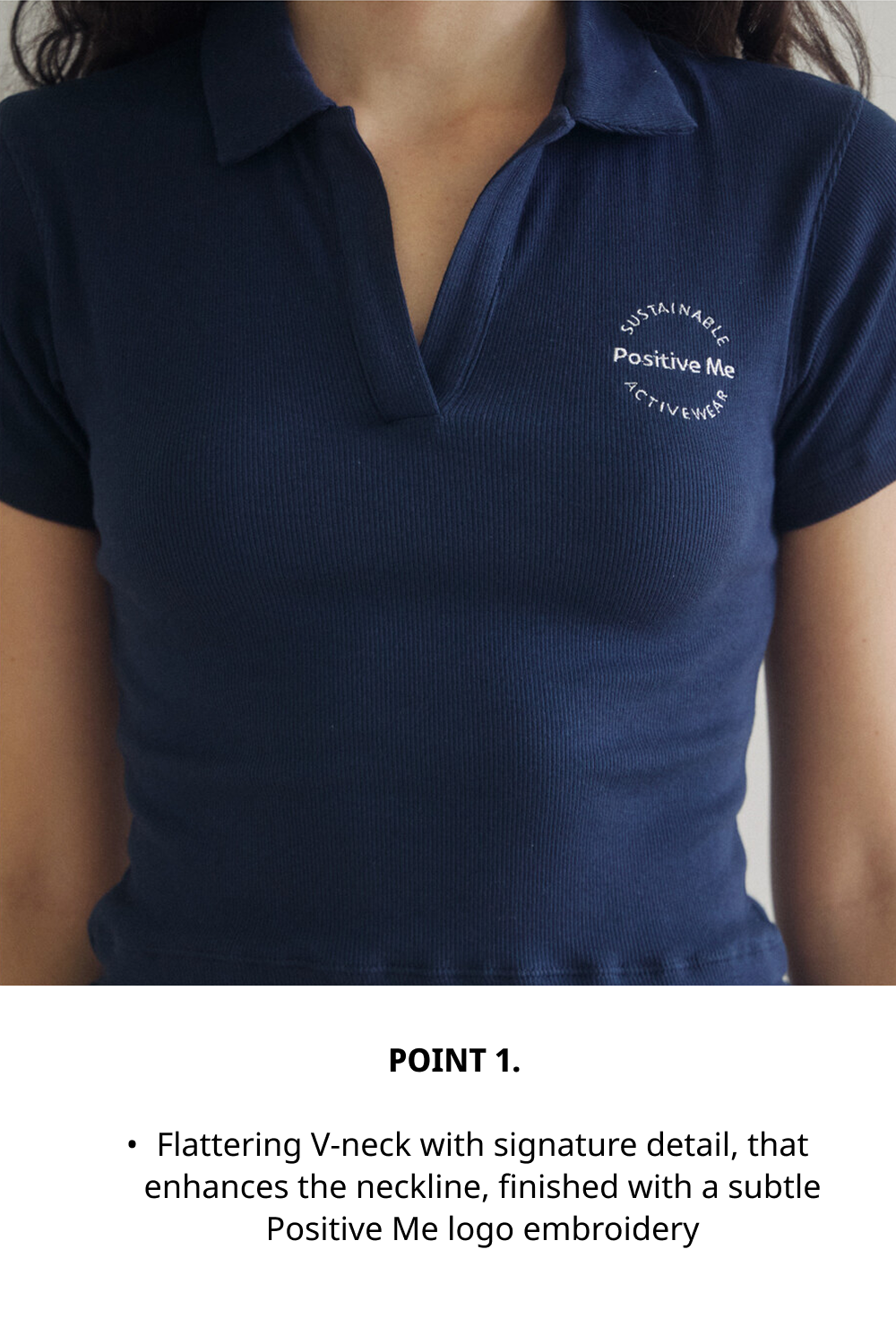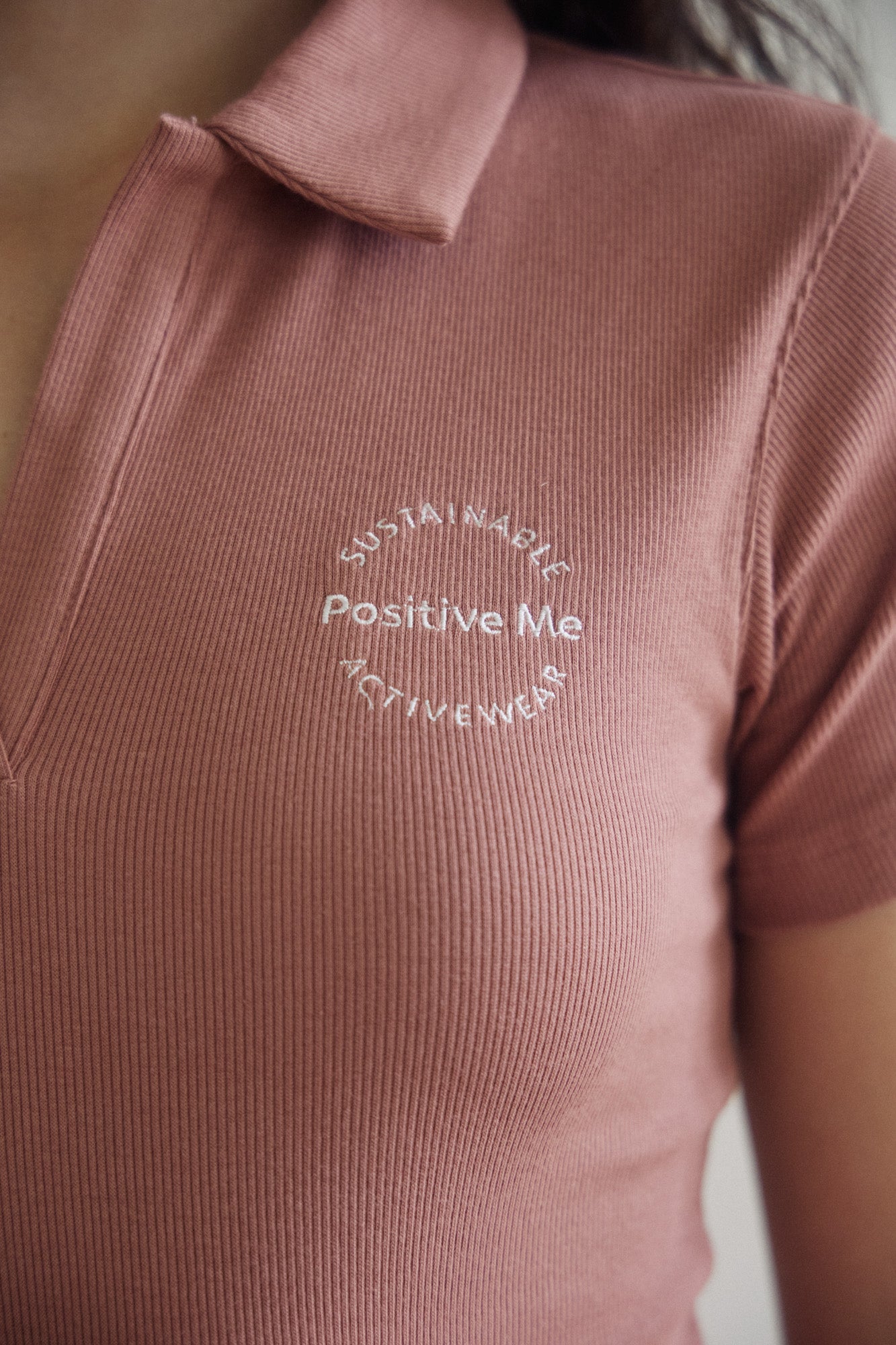 The clean collared neckline adds a polished finish that transitions seamlessly from casual routines to professional settings — whether you’re enjoying a slow morning coffee, attending an important meeting, or heading out for an evening walk. The ribbed texture creates a flattering, slightly sculpted silhouette, while the subtle Positive Me logo embroidery adds a touch of sophistication.