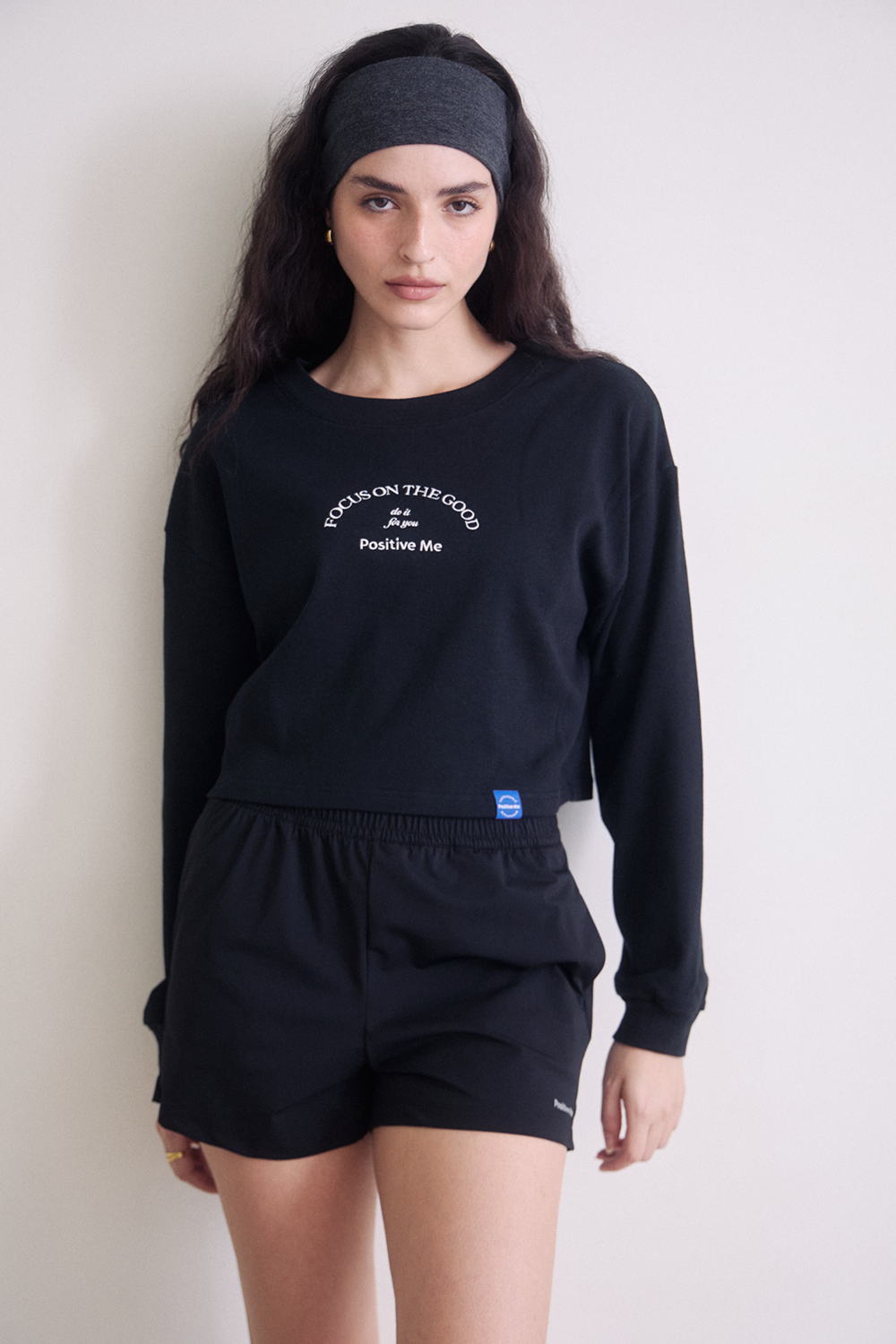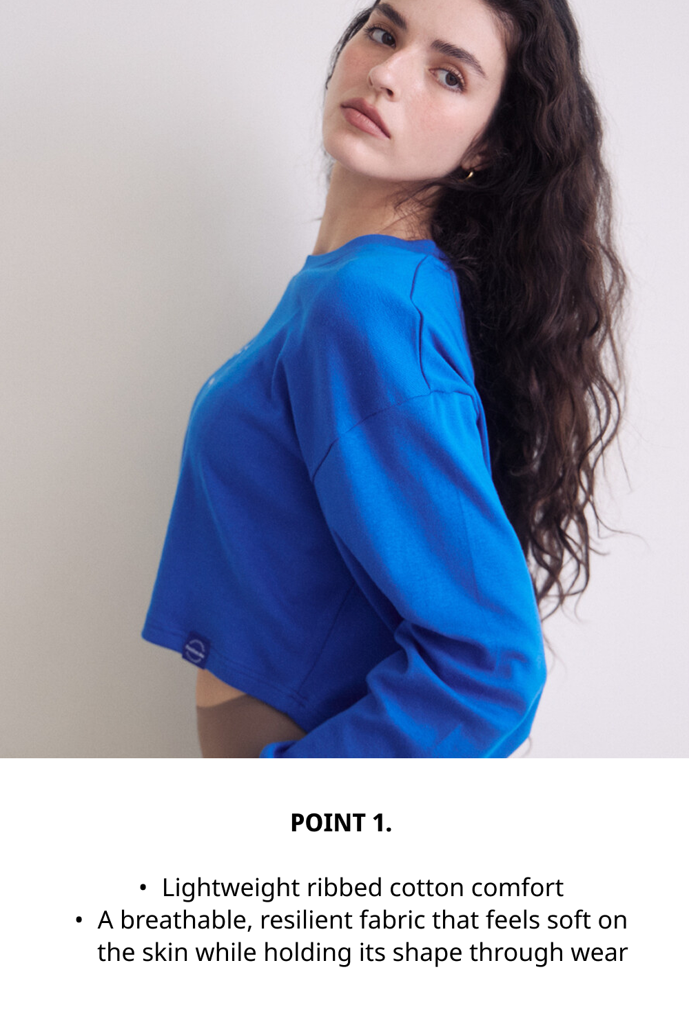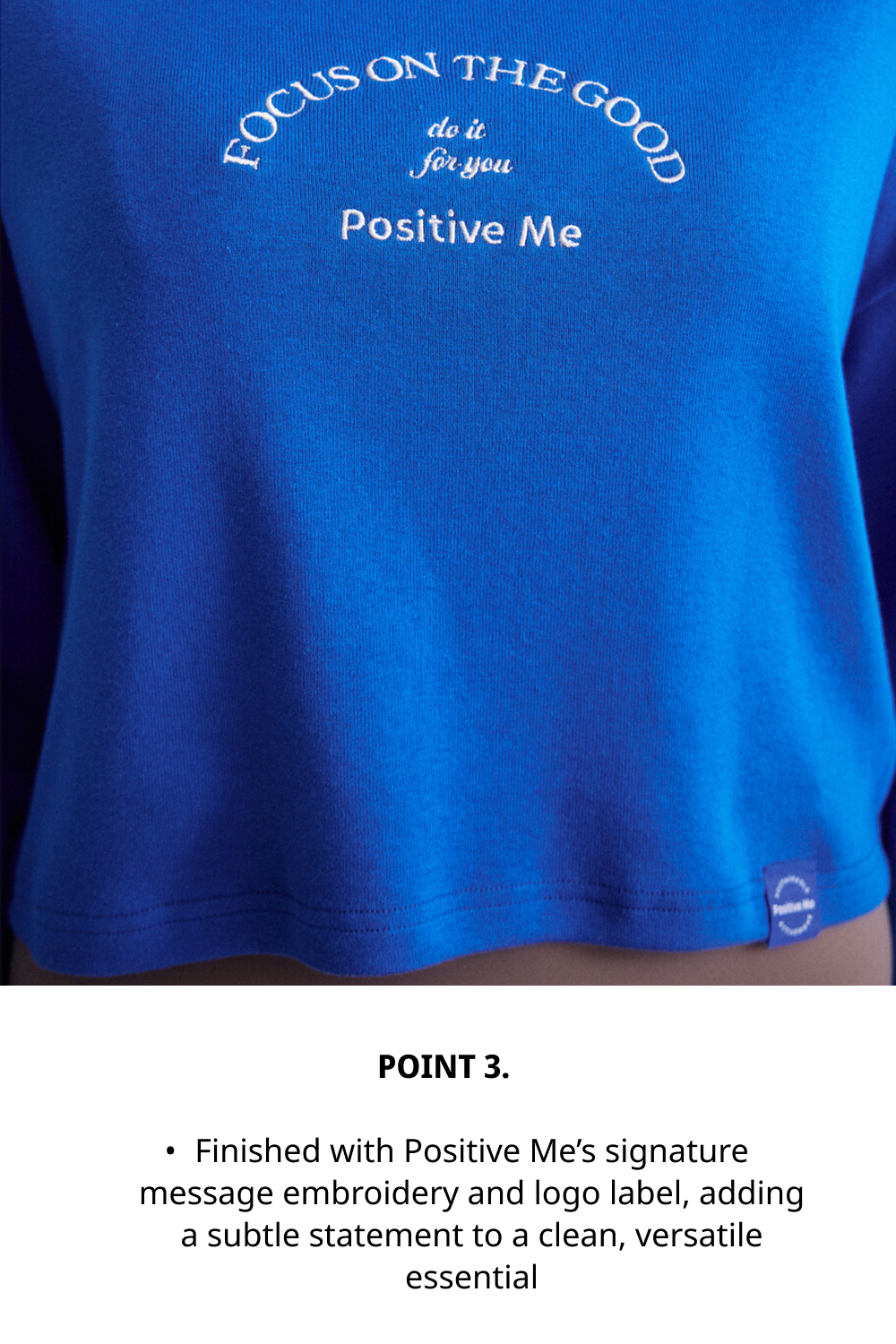 The semi-oversized silhouette drapes naturally over the shoulders and arms, while the cropped length highlights the waist for a balanced, flattering fit that complements every body type. Whether you choose the vibrant Positive Me Blue, the deep and refined Black, or the soft, versatile Creamy White, each color is designed to elevate your daily look with its own unique personality.